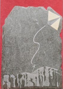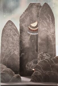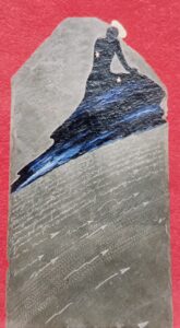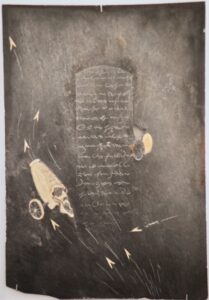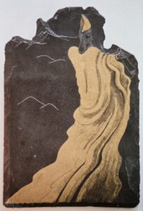 In 1992, at the Municipal Library of Lille, were presented old slates, engraved and painted, coming from the roof of a cathedral under renovation. Long raised to the sky, they lived in the proximity of the sacred, exposed to invisible prayers as much as to bad weather.
