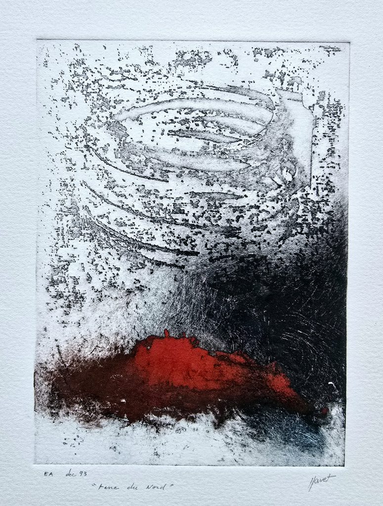 A spiral sinks into the bowels. Mine shaft, telluric vortex, aspirating vortex. The grainy texture of etching – acidic that bites metal – evokes coal dust, matter falling apart, the world crumbling. At the bottom, a blood-red mass. The incandescent coal in the depths. The burning heart of the earth. Or perhaps the blood of miners, the violence of underground work, the open wound in the ground.