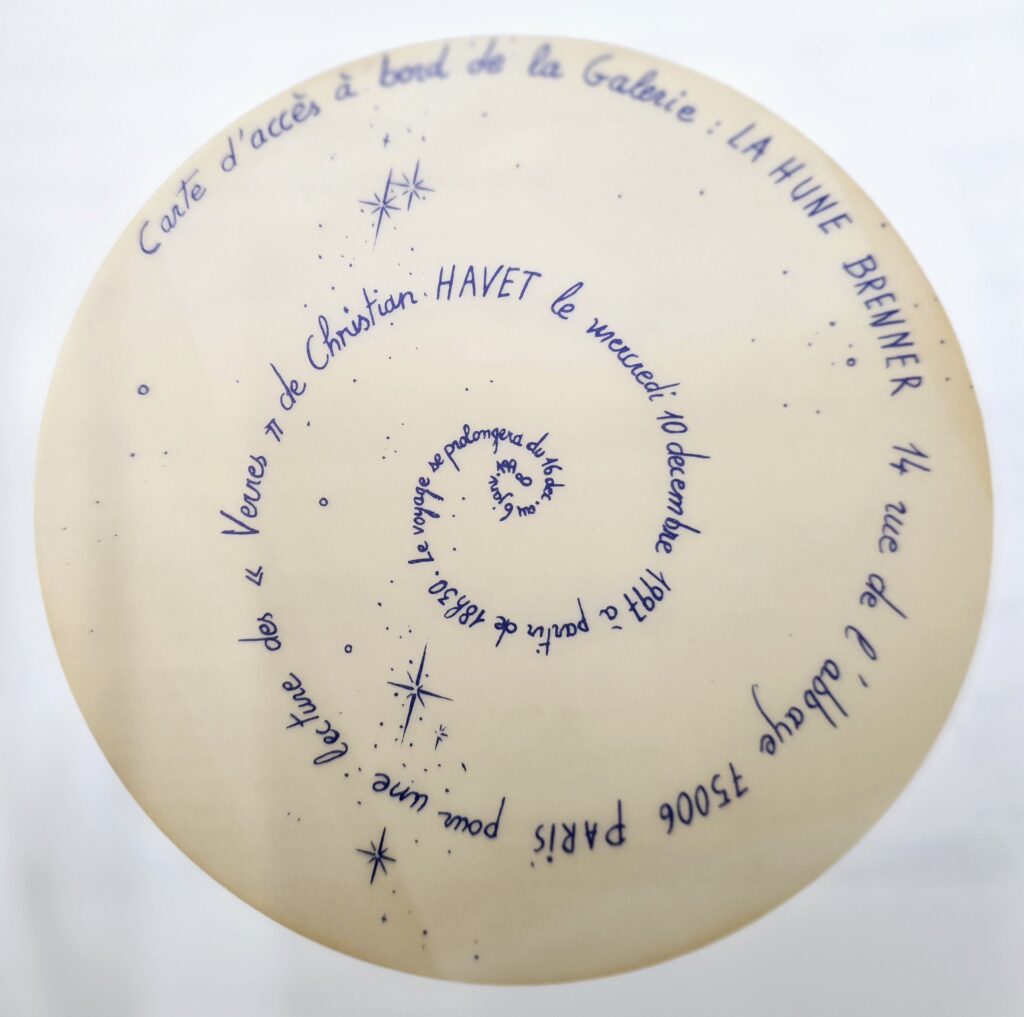 – Le support : Verres d’horloge de 9 cm. Objets fonctionnels destinés à protéger le cadran, à laisser voir le temps qui passe. Détournés, ils deviennent surfaces à contempler plutôt qu’à voir à travers.