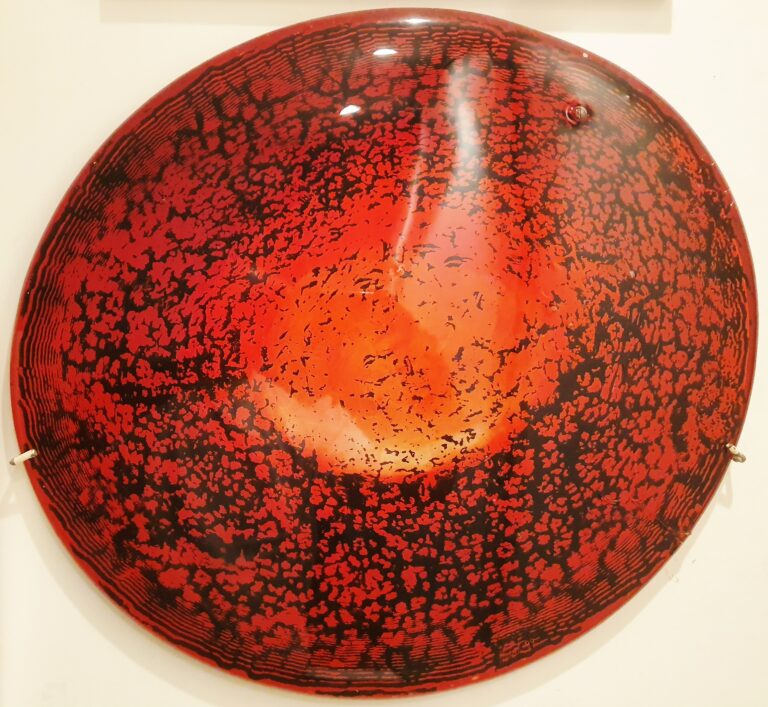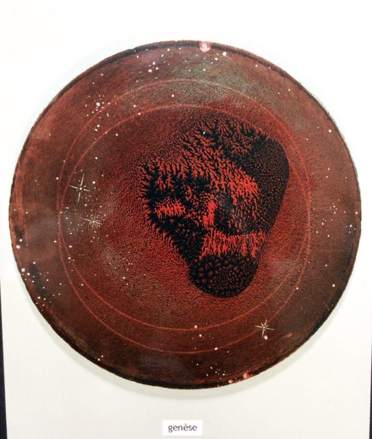 – Technique : Après les rehauts sur tuiles (1992), j’explore la peinture sous verre (1997). Techniques anciennes, artisanales, exigeantes. Refus de la facilité. Recherche de la contrainte féconde. On travaille à l’envers, en vers, en l’an vert … Le geste doit anticiper son propre renversement. Patience. Précision. Dialogue intime avec la transparence.