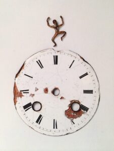 The clock has lost its hands, emptied of its primary function. It no longer controls, it questions and no longer measures a regular flow. It becomes a framework, a field of experience and does not indicate any precise time, but suggests a series of states, discrete moments, similar to quantum jumps. On his old bare dial, a little metal man dances. Mechanical and poetic figure at the same time, he embodies a fundamental tension: that between the rigor of measured Time and the intimate experience of lived time. This dance marks neither the hour nor the duration. It opens a space of suspension, an interval where Time becomes sensitive, almost fragile. What if, at the heart of this incessant movement, dancing was a way to resist him or to live in it fully ? the dancer evokes a particle in motion: his position is never quite fixed, his gesture only makes sense in the gaze of the one who observes it.