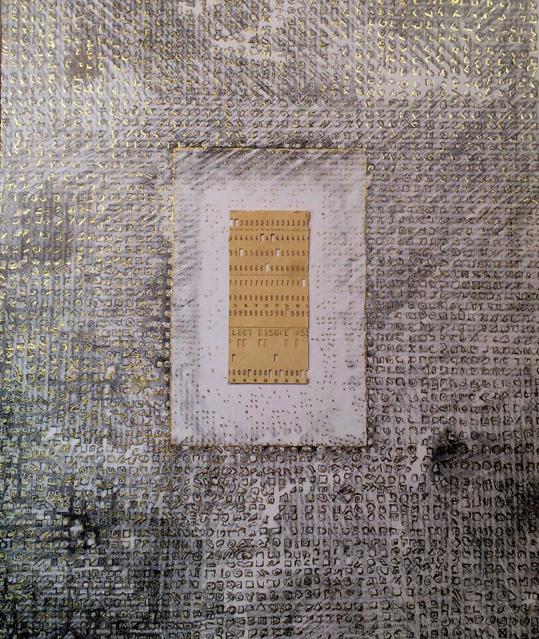 In the center, a punched antique computer card imposes its tranquil authority. She seems to guarantee that a system existed, somewhere, even if no one remembers it. Around her, the drawn signs dance, golden and indecipherable, as if the writing had decided to keep its secrets secret.