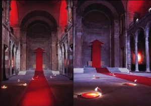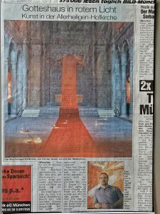 He brilliantly combines images to create an immersive visual experience. The church, illuminated with a red light, and the gongs with their deep and vibrant sound offer a striking atmosphere. Giant drops of blood are reminiscent of those engraved on the stone floor, bearing the inscriptions ‘Harmony’ or ‘Wound’. « The atmosphere is impressive, almost apocalyptic, » said Antoine Grassin, patron and consul general of France in Munich. He particularly appreciated the combination of visual and acoustic elements.