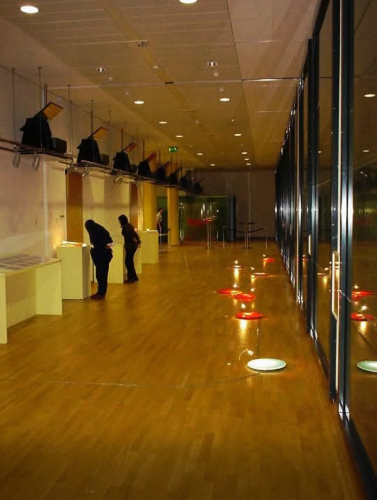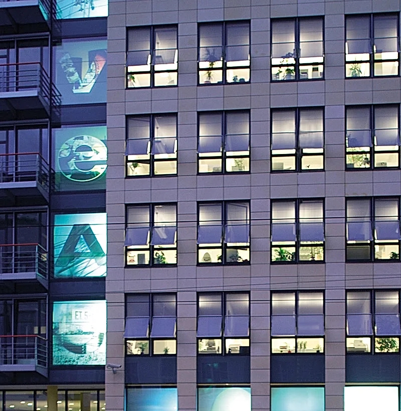 Then, on the front of the VEAG, a video projects what the glass contains: the energy finally delivered from its translucent prison. Video projection is itself an act of pure energy, a collective experience, light pixels launched from the openings of architecture, photons shot like arrows from the projector to the outside, transforming the cold facade into a living screen. This facade becomes urban epiphany: the Berlin passers-by, pressed in their daily lives, are suddenly stopped by this riot of light. The video pulses, breathes, dialogues with the falling night. She is the free double of the glasses – what the interior works whisper, the facade screams.