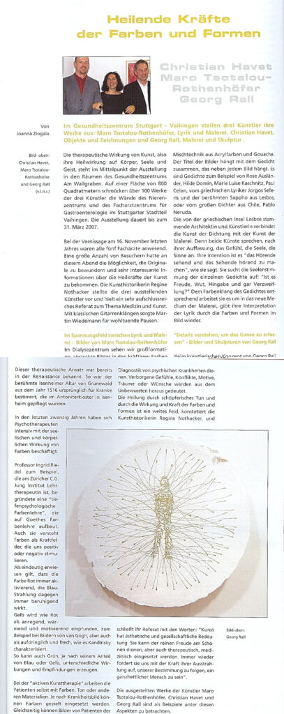 The therapeutic effect of art, i.e., its healing effect on body, soul, and spirit, is the focus of the exhibition in the rooms of the Health Center on Wallgraben. Spanning an area of 800 square meters, over 100 works by the three artists adorn the walls of the Kidney Center and the Specialist Center for Gastroenterology in the Stuttgart district of Vaihingen. The exhibition runs until March 31, 2007.