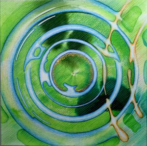 Où voyez-vous les frontières ? Entre quel cercle et le suivant ? La séparation est optique, pas réelle. Tout vibre ensemble dans un seul organisme cosmique. Le vert : couleur du renouveau, du printemps éternel, du oui incessant à l’existence, couleur du cœur. Ces ondes-cellules pulsent comme bat le cœur du monde. Les ondes, la vie ne s’arrête jamais, elle pulse, se propage au delà de notre perception.